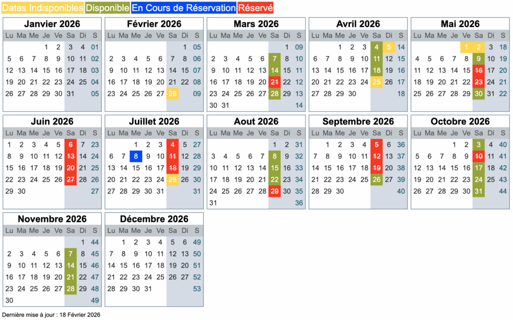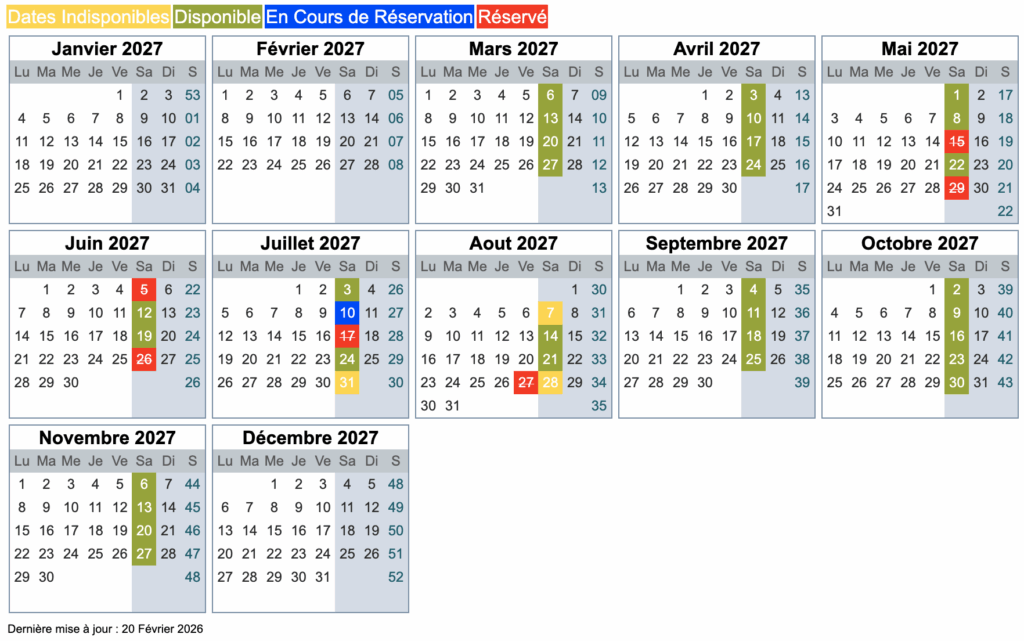 Bienvenue sur le calendrier des mariages pour les Saisons 2026 et 2027. Avant de prendre rendez-vous, assurez-vous bien que votre date de mariage est bien disponible.